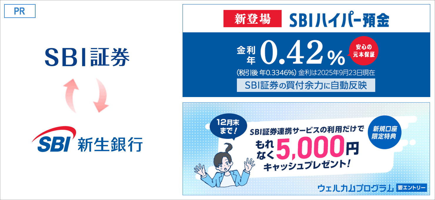 - 新規口座開設者限定!SBI証券連携サービスの利用などの条件達成でもれなく5,000円キャッシュプレゼント!(要エントリー)その他条件の達成で今なら最大22,000円プレゼント!