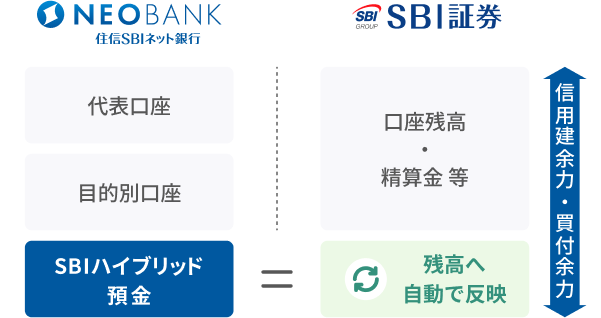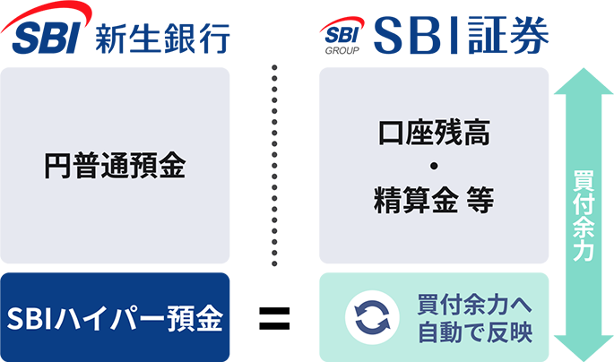 SBIハイパー預金の残高はSBI証券の株式や投資信託の買付余力に自動反映されるため、SBI証券とSBI新生銀行の口座間での入出金の操作は必要ありません。