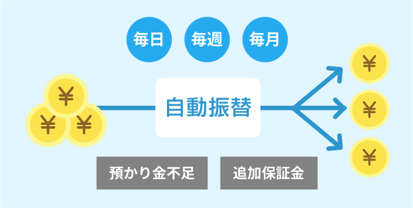 また、信用取引での預り金不足額や追加保証金が必要になった場合にも、代表口座から証券口座に自動振替することができます。