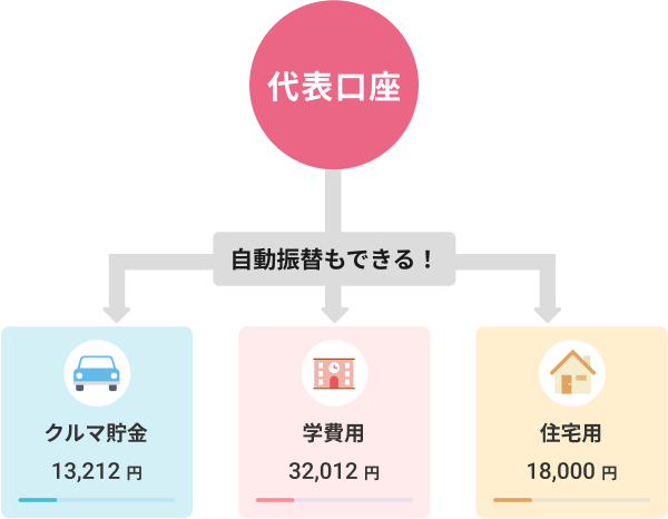 定額自動振替を設定することで、あらかじめ決めた金額を、自動で代表口座から仕分けしておくことができます。